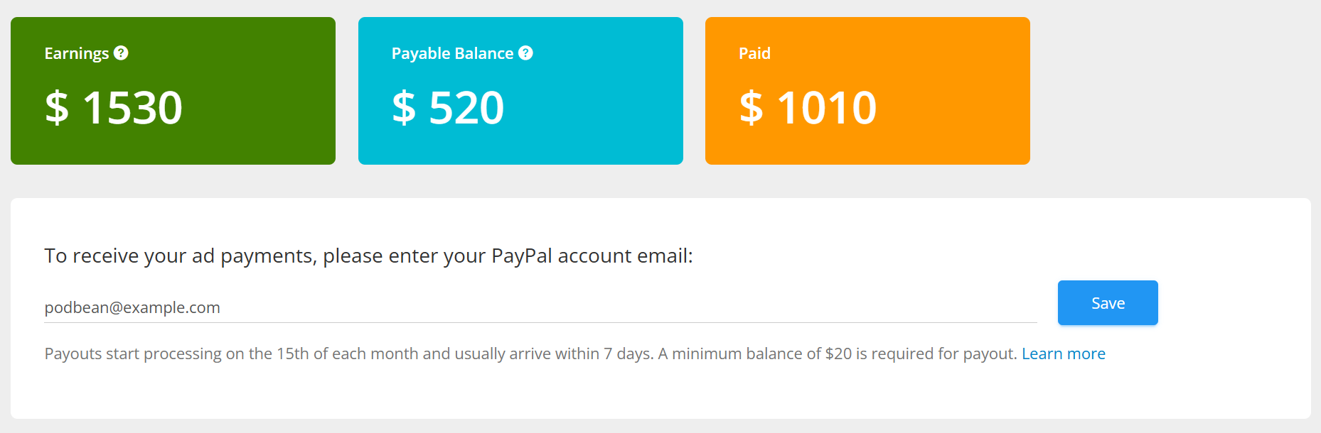 Please note that at present, PayPal is the only available option for receiving ad revenue.To receive your ad payments, please go to the Payments page at Podbean Ads Marketplace to enter and save your PayPal payout account email.