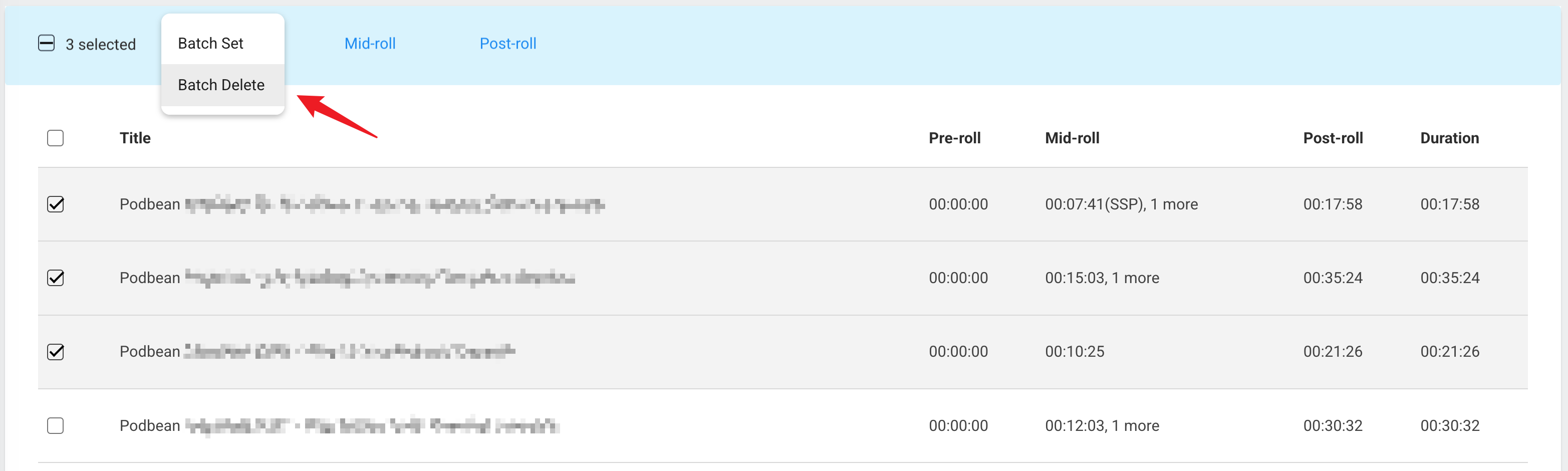 - Click Pre-roll, Mid-roll, or Post-roll and select "Batch Set" to apply time slots for the selected episodes: