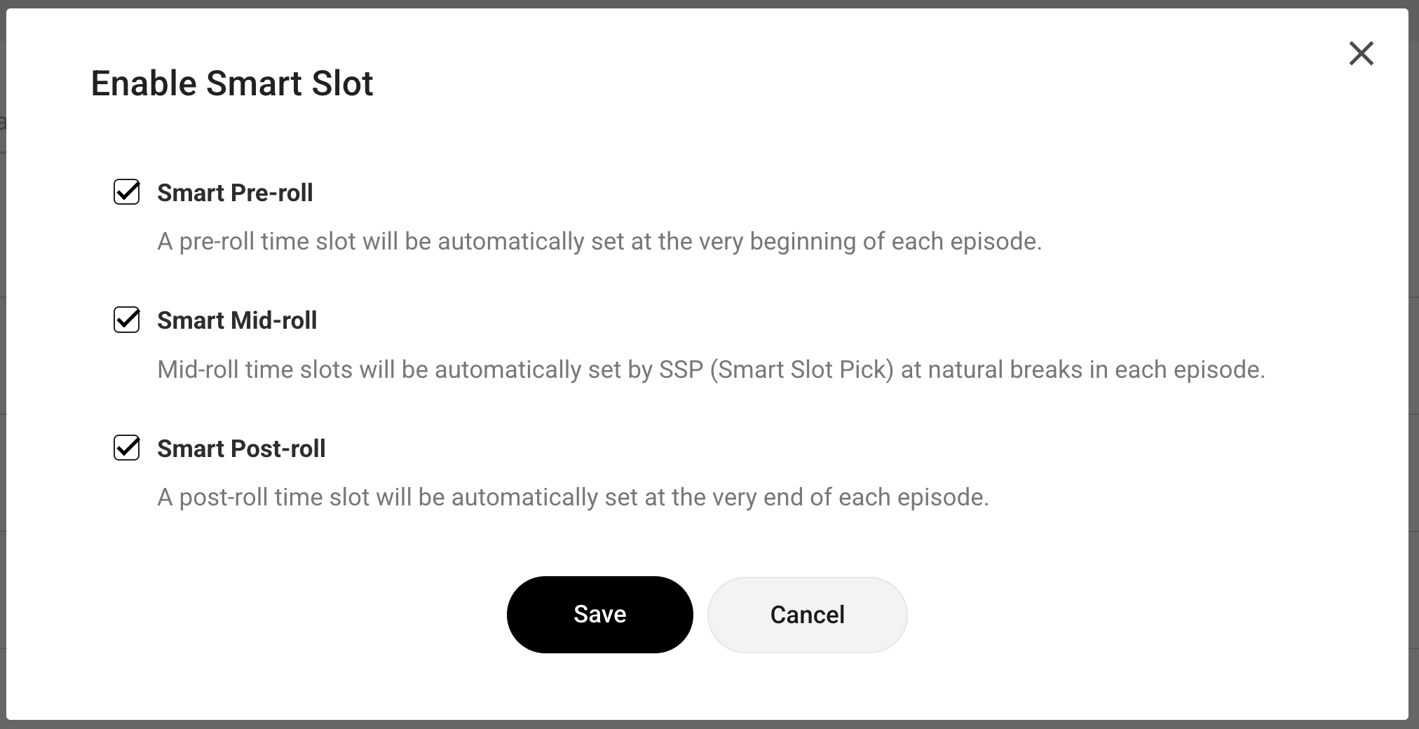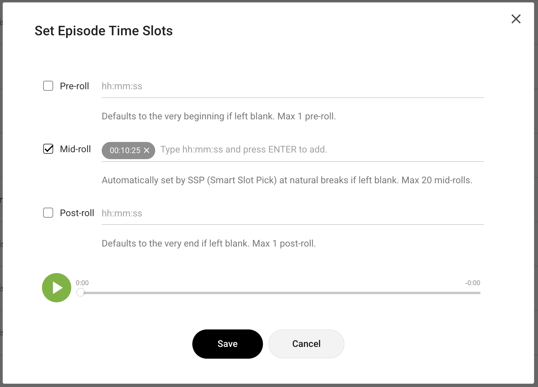 Notes: - The time slot you set corresponds to the timestamp in your original, ad-free episode audio. You do not need to account for ad lengths when setting time slots. - If you check a position but leave the timestamp blank, the system will apply defaults: Pre/Post-roll at the very start/end, and Mid-roll at natural breaks via SSP.