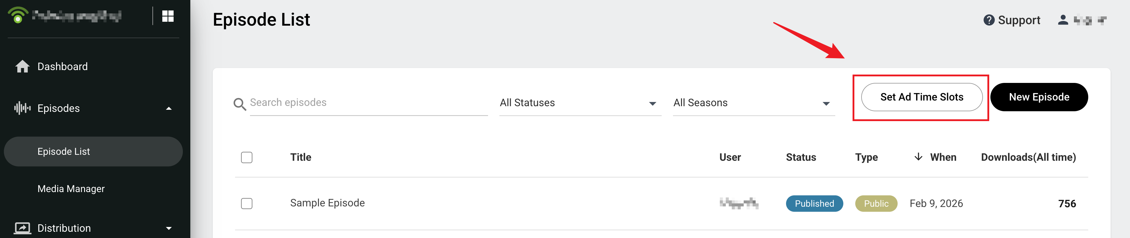 Once you have started using Podbean's ad features (such as using PodAds DAI or joining the Ads Marketplace), you will see the Set Ad Time Slots button on your podcast dashboard’s Episode List page. Click it to view and manage time slots for all your episodes.