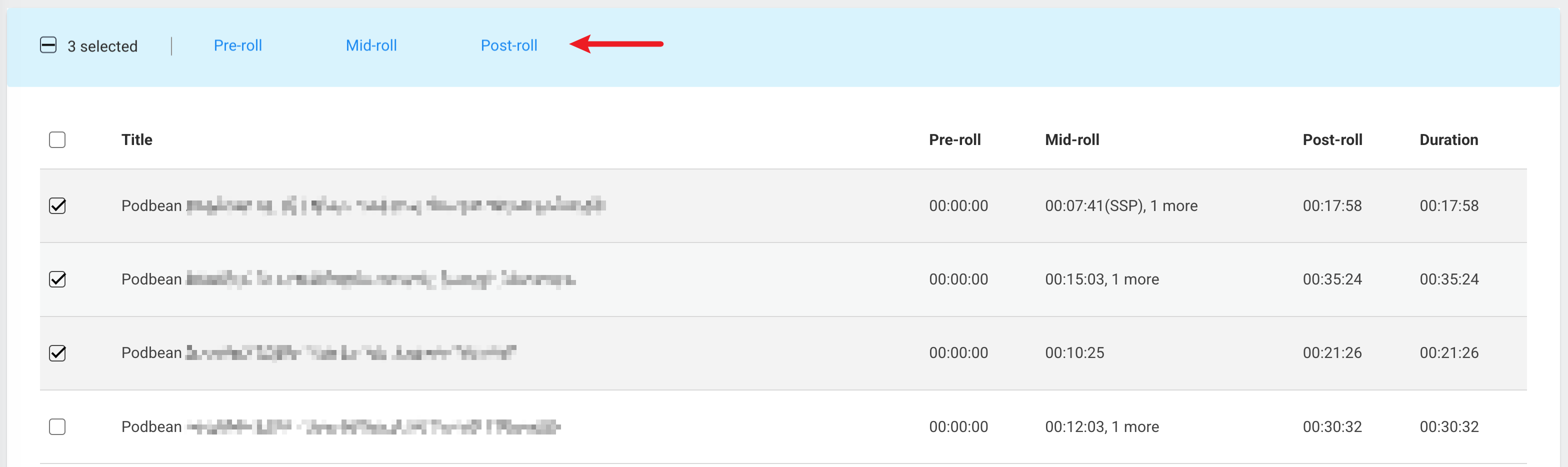 - Click Pre-roll, Mid-roll, or Post-roll and select "Batch Set" to apply time slots for the selected episodes: