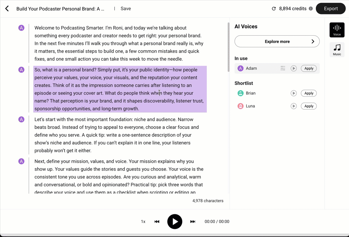 - Selected paragraphs: Select the paragraphs and click the "Apply" button next to the voice.