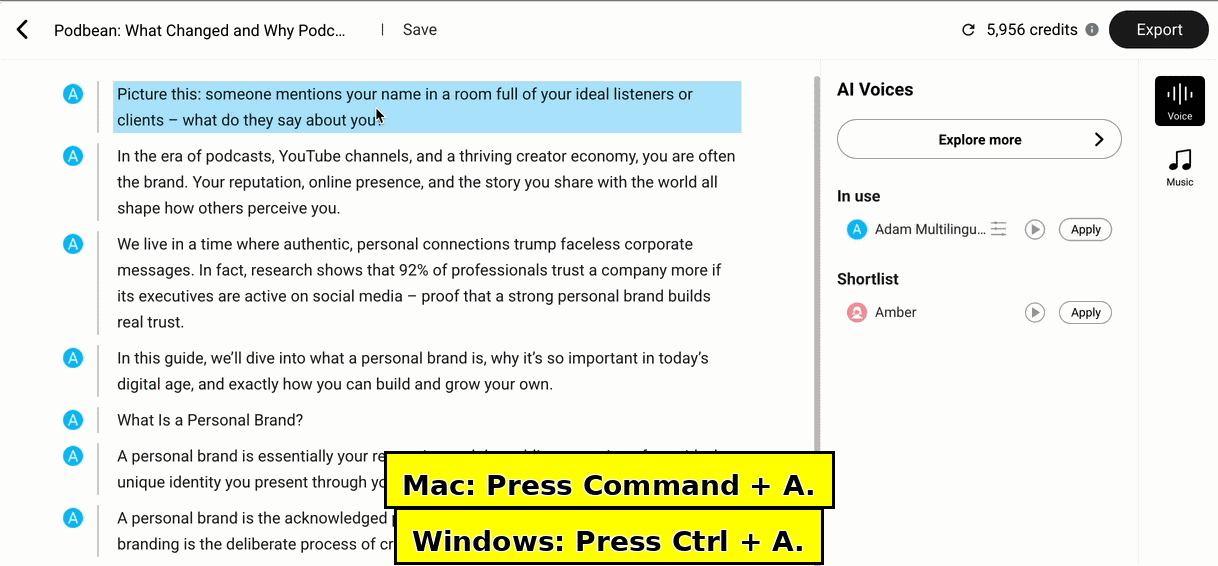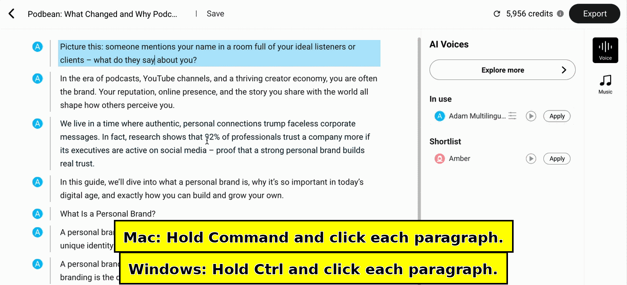 Learn how to efficiently select paragraphs and apply voices using keyboard shortcuts.